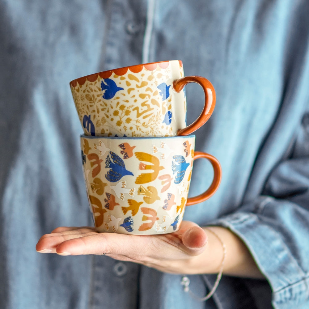 Komplektą sudaro du keramikiniai puodeliai, papuošti šiltų atspalvių grafiniu motyvu.