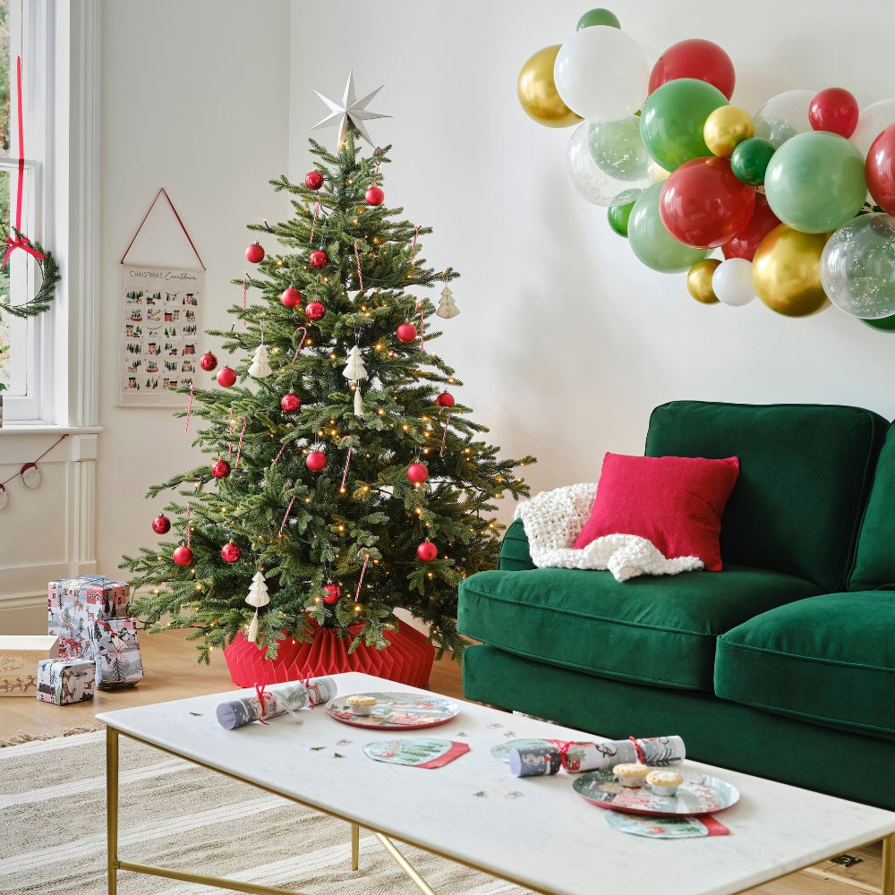 Šios dekoracijos spinduliuoja šventinę džiaugsmą ir yra pilnos sodrių raudonų atspalvių bei žavingų balionų, kurie asocijuojasi su maloniais momentais su šeima.