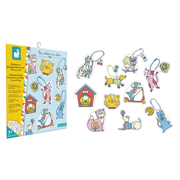 Prancūzų prekės ženklo „Janod“ kūrybinis rinkinys „Cats and Dogs“ iš susitraukiančio plastiko leidžia pagaminti 5 raktų pakabukus ir 5 magnetus.