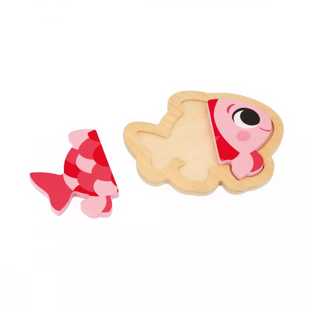 Medinė dėlionė vaizduoja žuvį, papūgą, šunį ir katę, o jų pagrindai yra suformuoti taip, kad vaikams būtų lengviau.