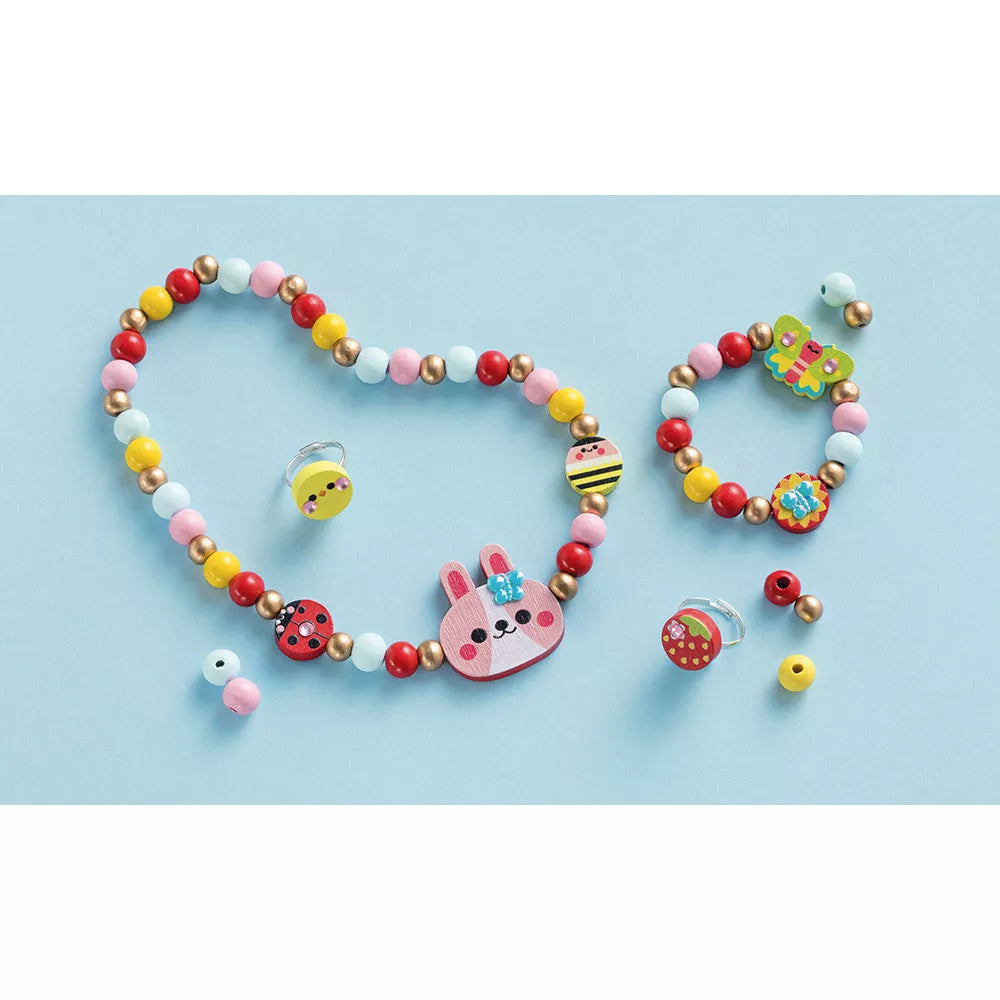 - Komplekte yra: elastinga virvelė, dvi didelės figūros – kiškis ir drugelis, 3 mažesni apvalūs elementai su vabzdžių piešiniais, 33 spalvotos ir 22 auksinės medinės karoliukai, 2 reguliuojami žiedai ir lipdukų lapas.