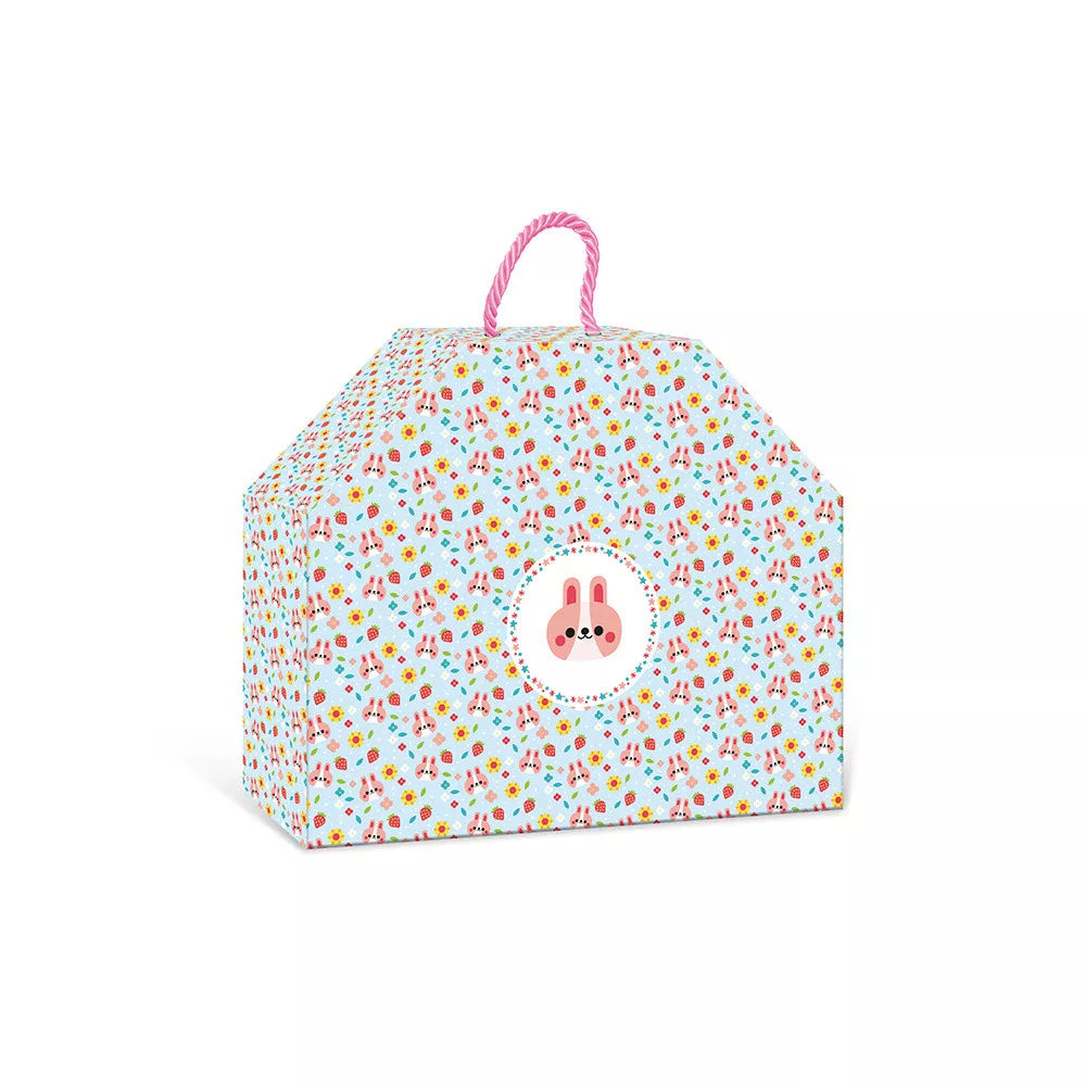 Visas rinkinys supakuotas į gražią kartoninę dėžutę, kurios forma primena namelį su rankena.