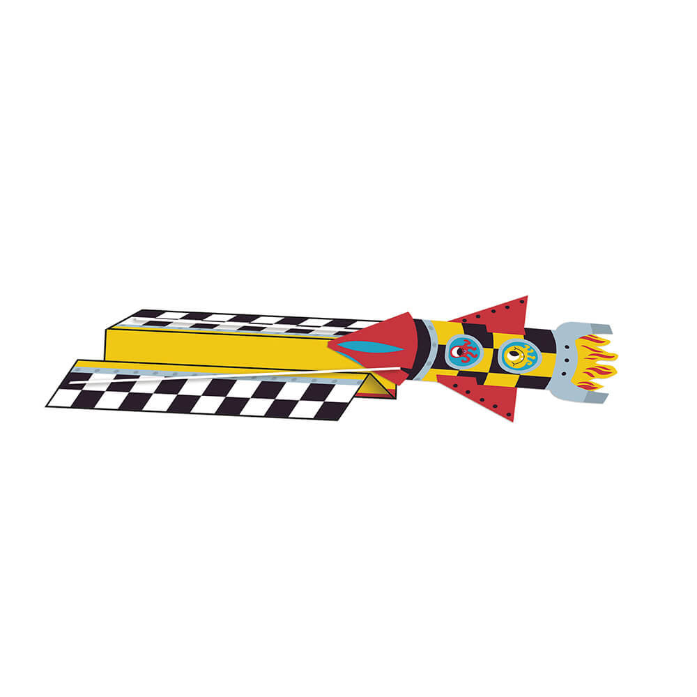 Kūrybinis rinkinys „Popierinės raketos su paleidimo įrenginiu“ iš Janod. Vaikas turi galimybę sukurti 10 kosminių raketų.