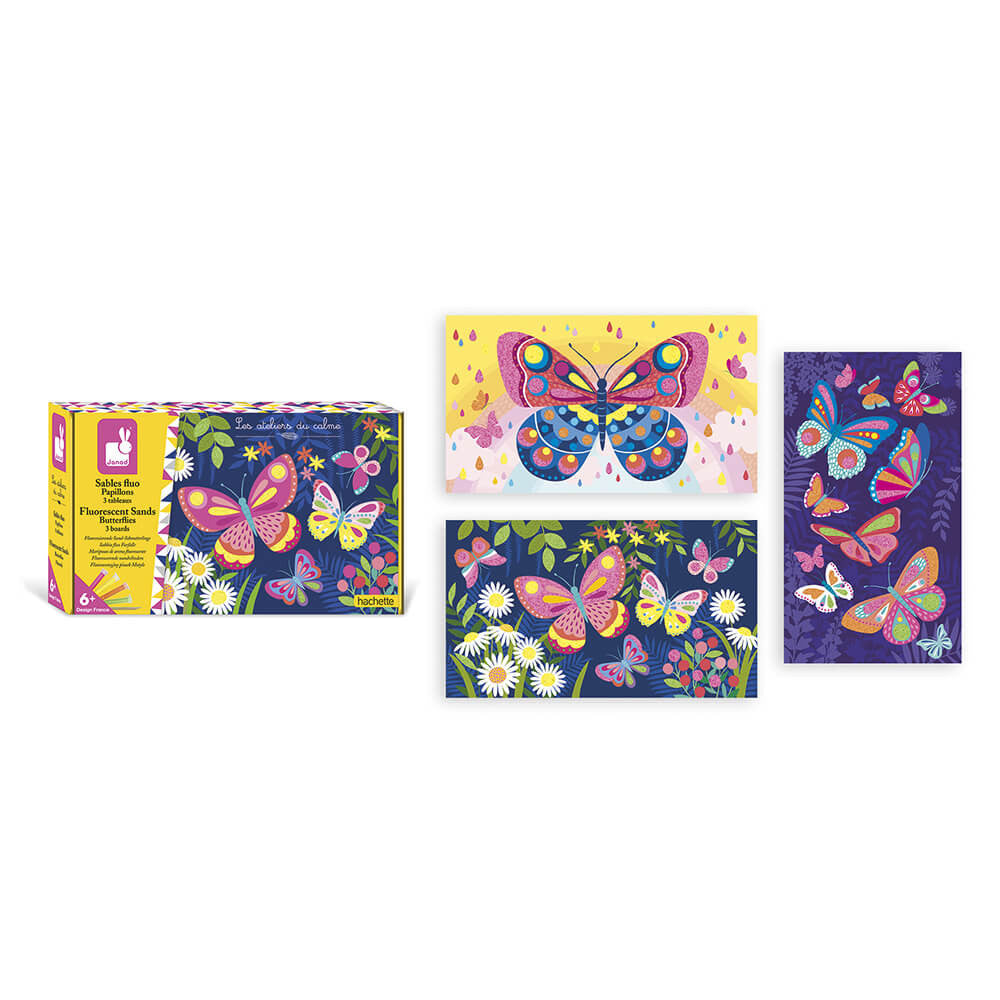 Kūrybinis rinkinys „Fluorescent Sand Butterflies“ („Fluorescencinės smėlio drugeliai“) iš „Janod“. Vaikas turi galimybę sukurti 3 paveikslėlius su šiais spalvingais vabzdžiais.