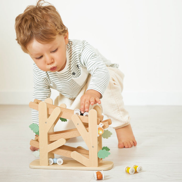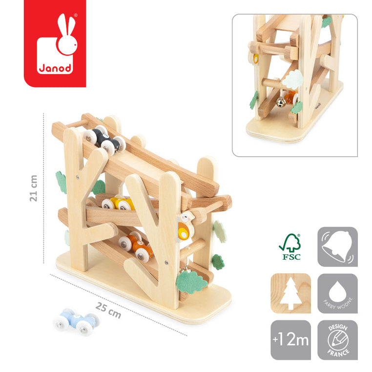 Prancūzų prekės ženklo „Janod“ medinė skruzdžių lenktynių rampa „Ballodrome“ yra puiki žaislas vaikams nuo 1 metų.