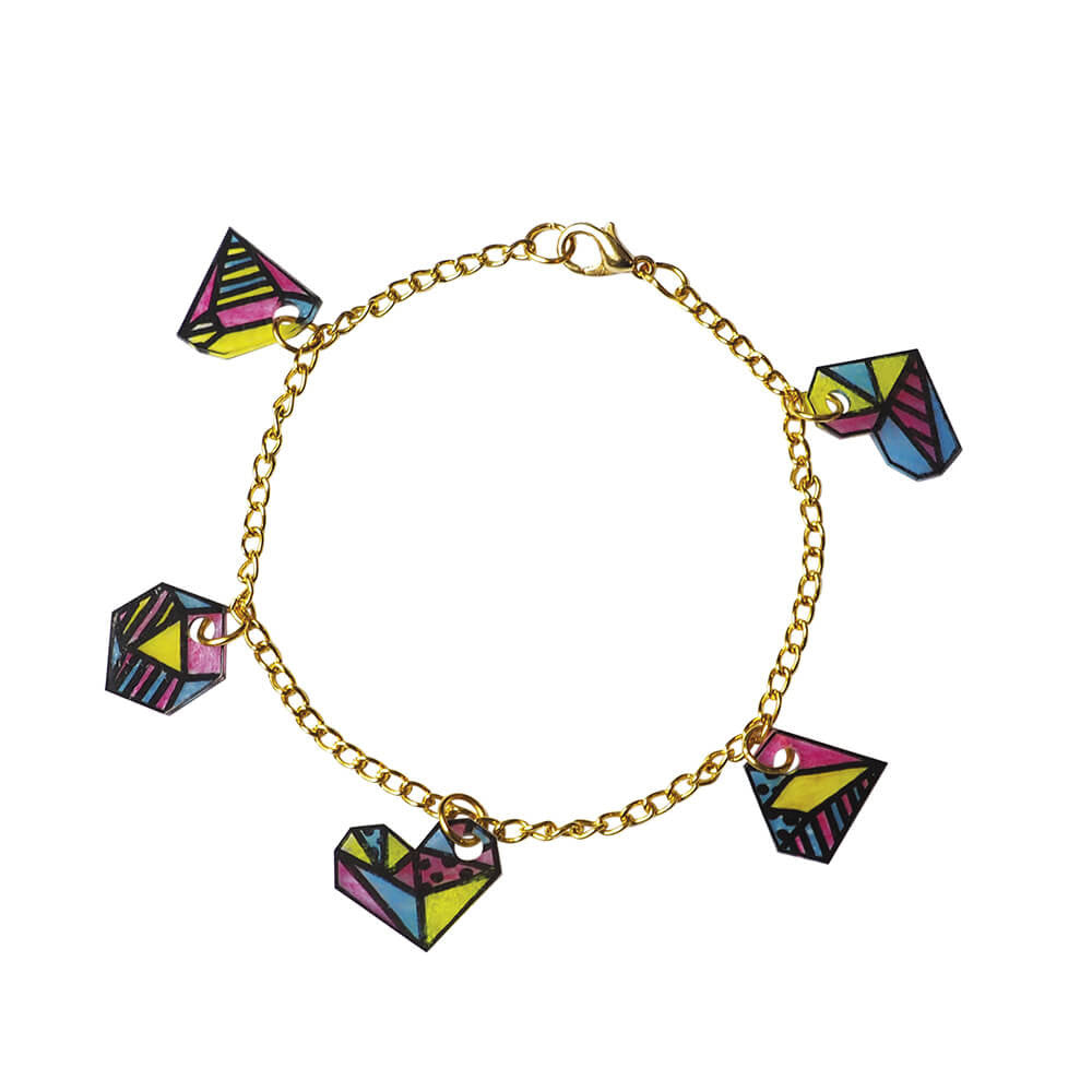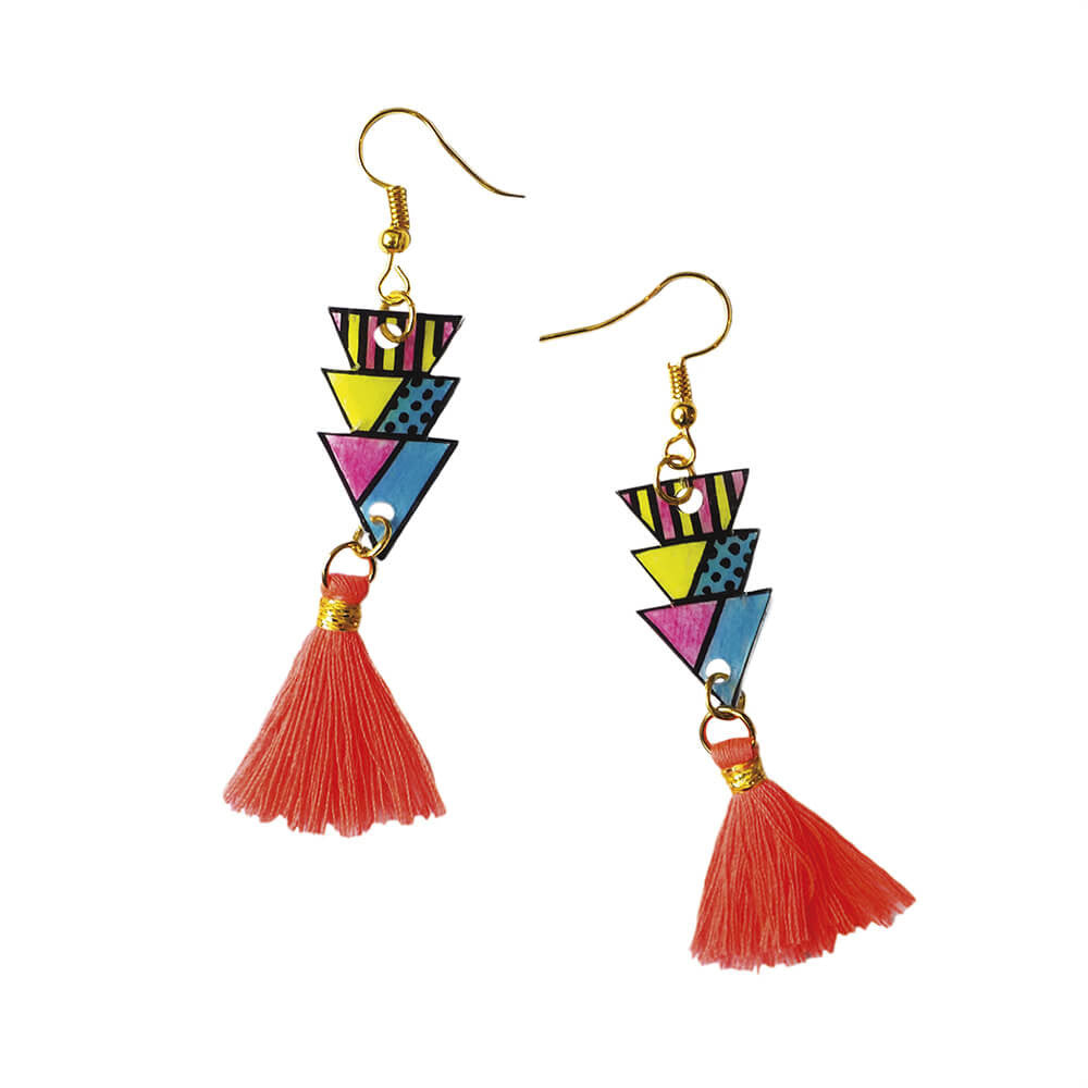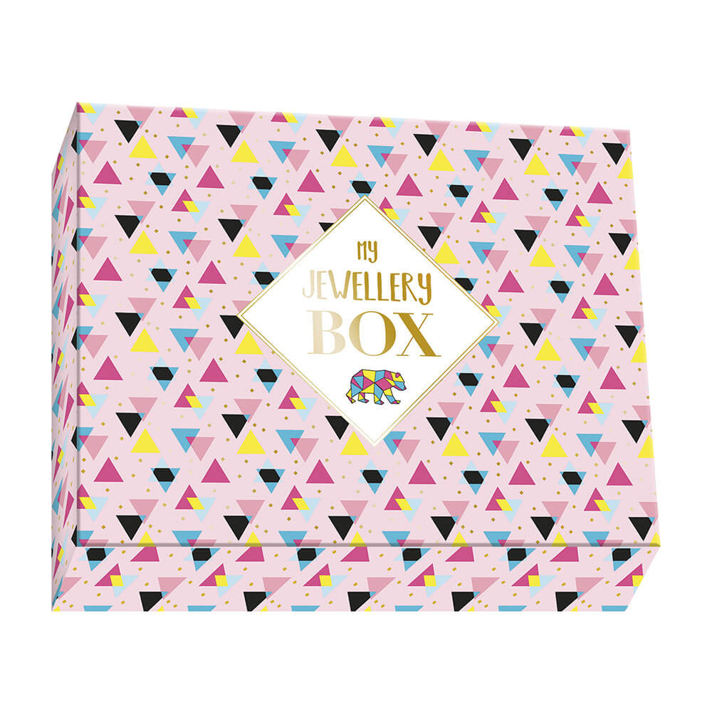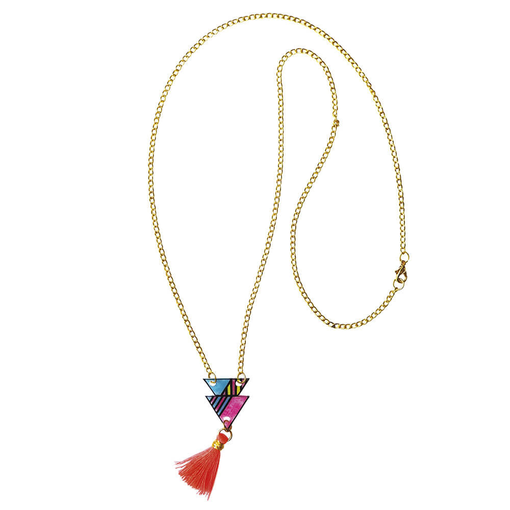 Janod papuošalų gamybos rinkinys, su kuriuo galite sukurti 7 papuošalus: 2 apyrankes, kaklo grandinę, sagę, 2 žiedus ir auskarus su spalvingais geometriniais motyvais, trikampiais, grafiniais pandos ar kiškio atvaizdais.