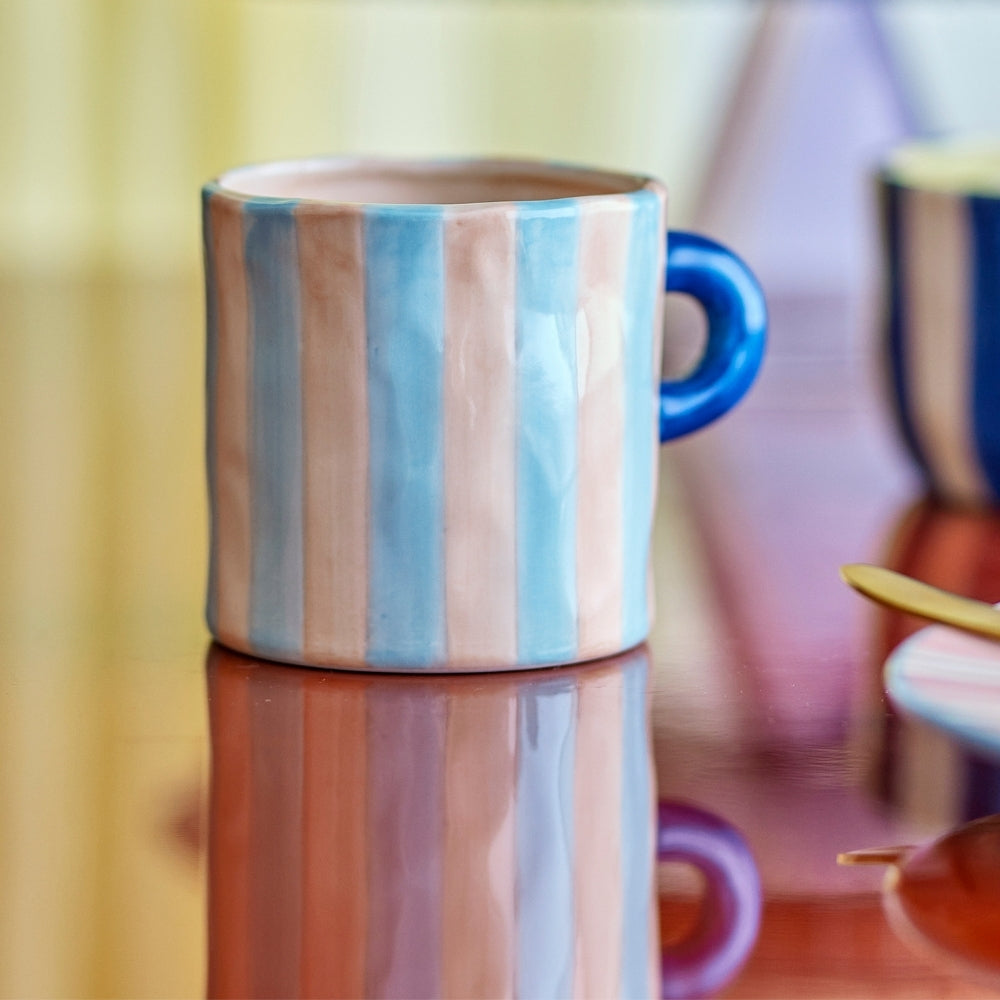 Rankomis dažytos skirtingų atspalvių juostelės suteikia kiekvienam puodeliui šiek tiek skirtingą išvaizdą, o blizgus paviršius ir spalvingos rankenos prideda lengvumo ir modernumo.