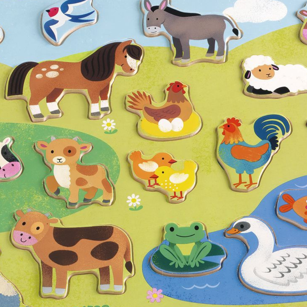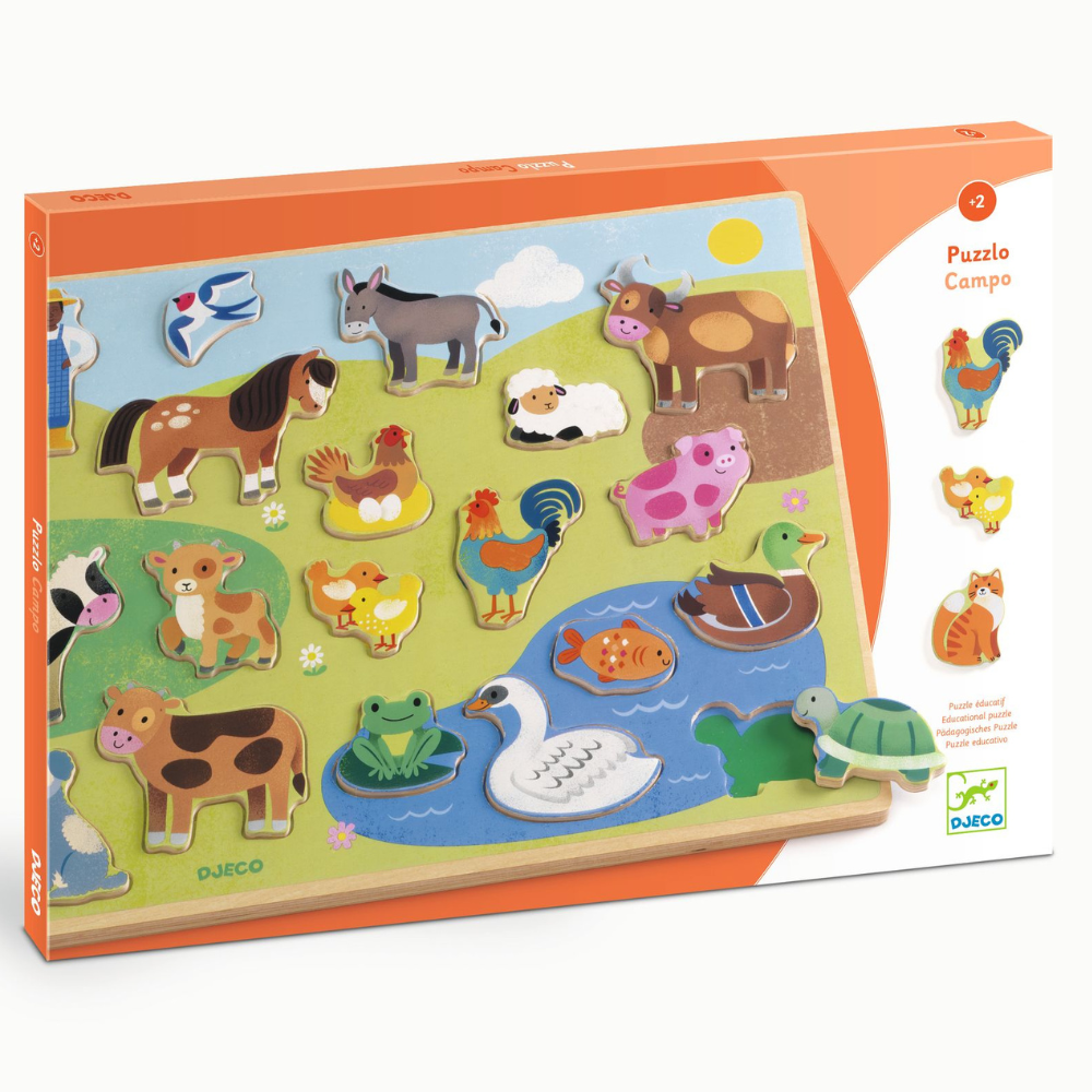 Dėl ryškių spalvų ir didelių dalių medinis dėlionė skatina laisvą žaidimą, ugdo koncentraciją ir smulkiąją motoriką, tuo pačiu plečia žodyną, susijusį su gyvūnais ir jų namais.