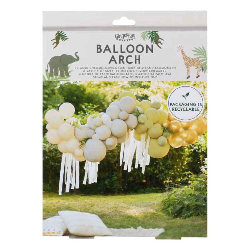 Pagaminta iš žalių, pilkų, kreminių ir aukso spalvos balionų, taip pat popierinių girliandų ir palmių lapų, ši balionų arka yra puikus būdas pradžiuginti savo svečius.
