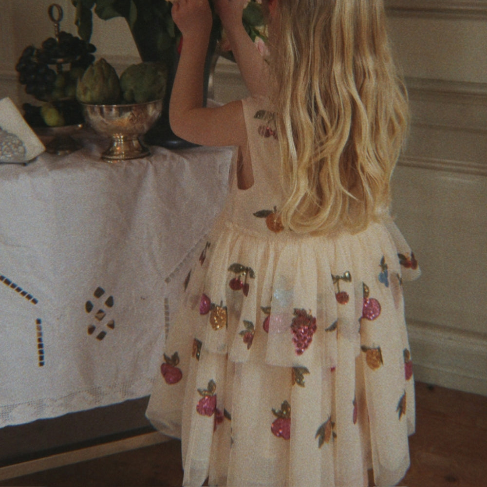 Konges Slojd mergaičių suknelė „Yvonne“ – tai spindinti, pasakų įkvėpta suknelė mažoms fėjoms, kurios mėgsta šokti ir suktis.